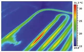 一個典型的實例是尋找地板加熱系統(tǒng)發(fā)生滲漏的位置。在紅外熱像儀的幫助下加熱系統(tǒng)的滲漏點可以被檢修人員發(fā)現(xiàn)并及時維修。精確確定滲漏點位置可以避免不必要的開挖過程,節(jié)省開支。